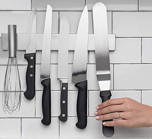 Save counter space with this magnetic knife bar that attaches to your kitchen wall using the included mounting hardware. The powerful magnets attract even the heaviest of blades, holding them firmly in place and keeping them out of the way until you're ready to chop, slice, and dice.