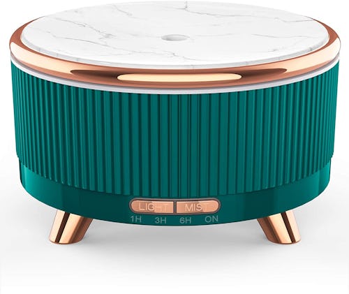 Fill your living space with aromatherapeutic mist using this essential oil diffuser that doubles as a design piece, thanks to its rich teal color, faux marble top, and rose gold accents. The ultra-quiet diffuser runs up to 20 hours on a single fill and operates on multiple timer settings. Just add a few drops of your favorite essential oil, and (if you want) choose from one of seven LED colors to light up your space.