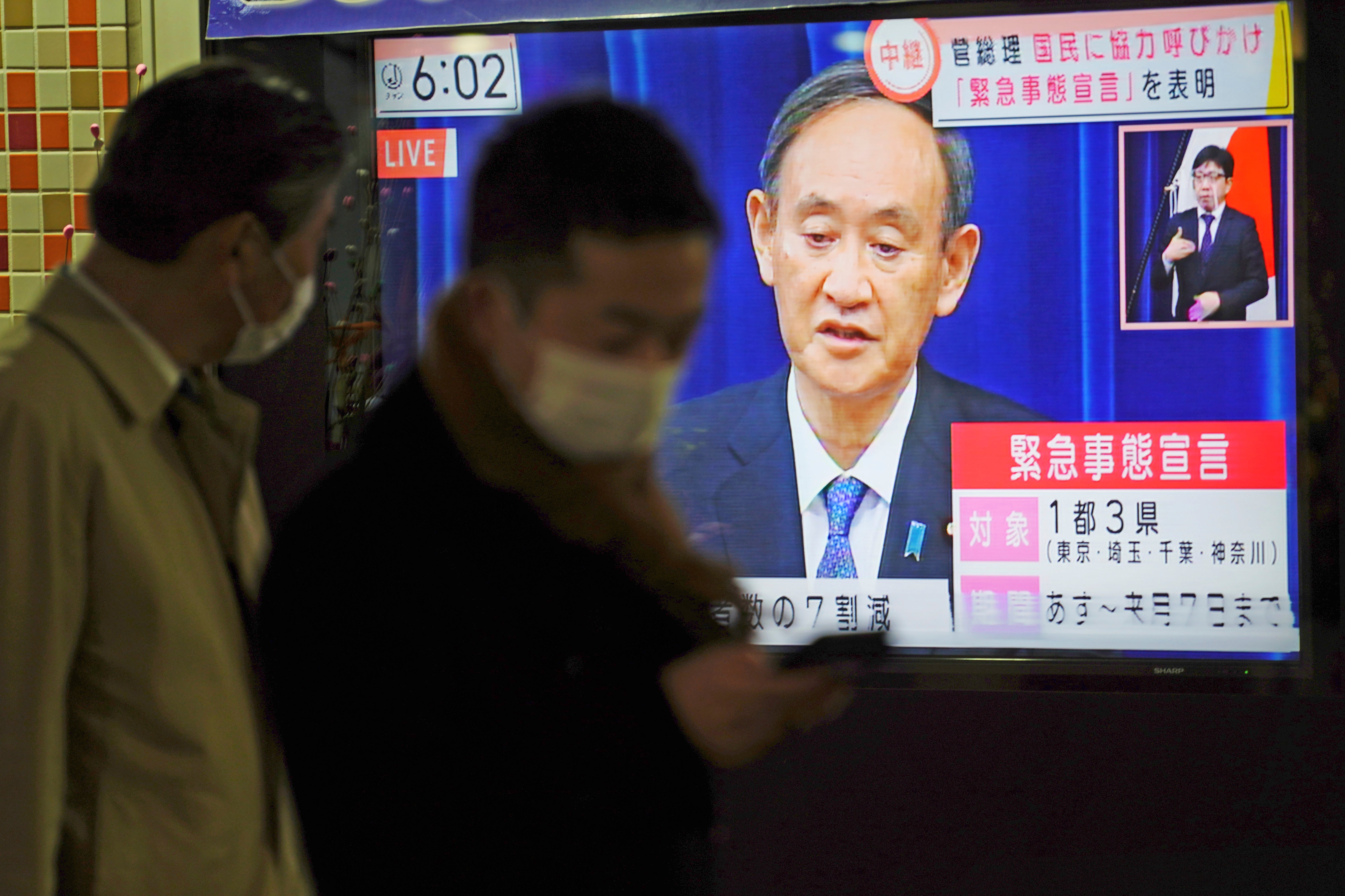 Prime Minister Yoshihide Suga issued the declaration at the government task force for the coronavirus. It kicks in Friday until Feb. 7, and centers around asking restaurants and bars to close at 8 p.m. and people to stay home and not mingle in crowds.