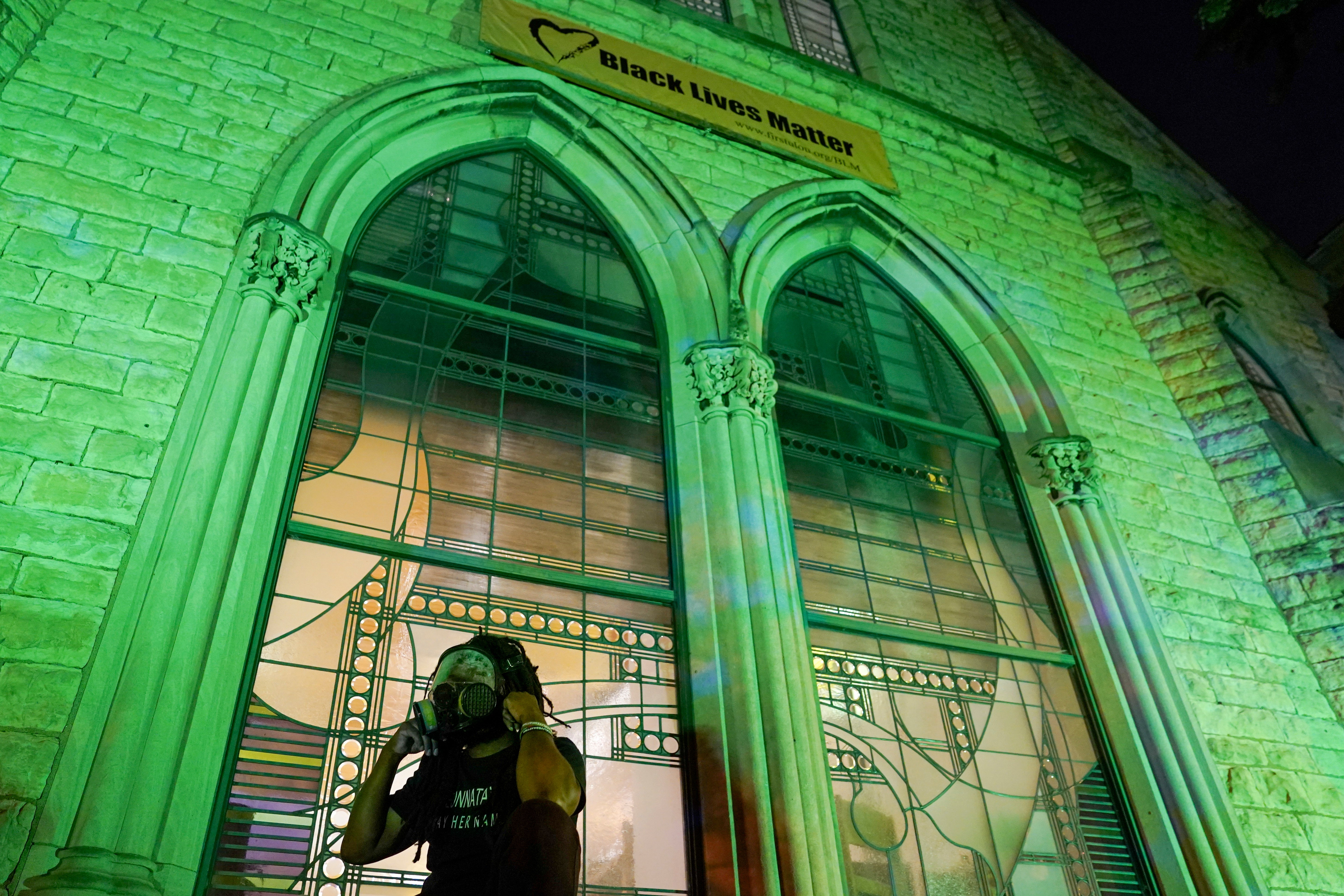 The stone gothic-style church was built in the late 19th century and is known for its progressive ideology. A large Black Lives Matter banner hangs outside it.