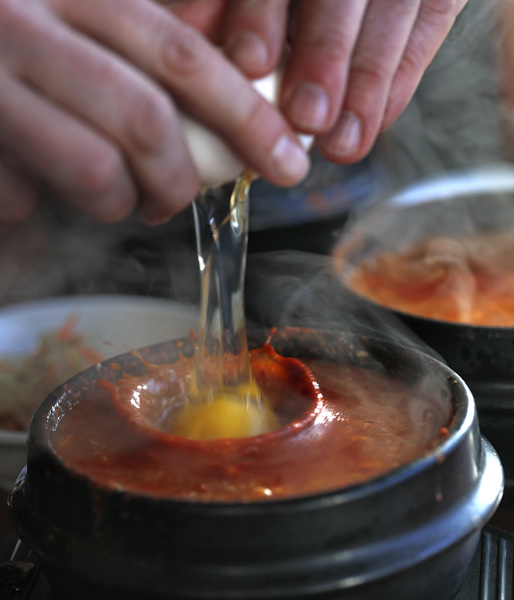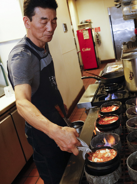 Dozens of times a day, she risks her arms and wrists to deliver bowls of a stew called sundubu to diners in the small, 24-seat restaurant she and her husband run near the University of Minnesota. The thick, earthenware bowls bubble noisily as she glides them from tray to table, as the stew boils like a volcano.