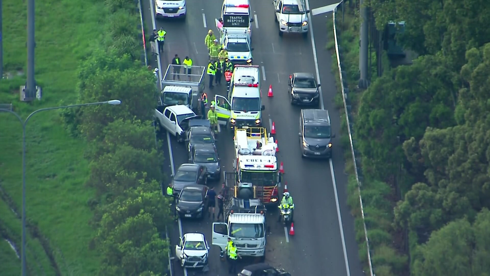 - There was a 12-car pile-up in Brisbane's south this morning and it caused a major traffic jam. No-one was seriously injured but six people were transported to hospital in stable condition after the accident on the Pacific Motorway. Police say the cause of the crash is unclear and it's "extremely lucky" there were no fatalities