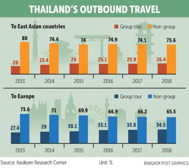 According to Kasikorn Research Centre, Thais travelling on their own outnumber those travelling with organised group tours. The non-group travellers accounted for 72% of total outbound travellers in 2018 and 72.8% in 2017.
