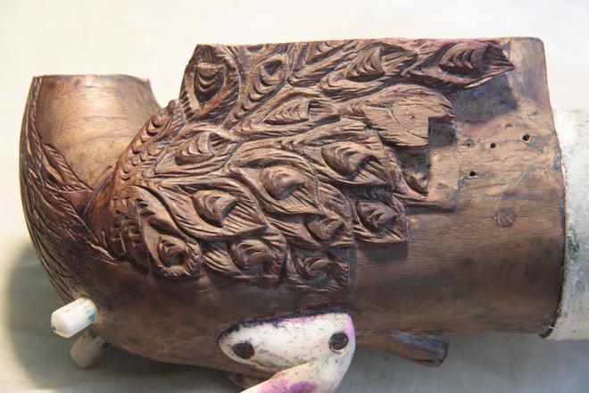 Kunal, seeking to learn sculpture, took a break, found himself a real teacher, Ravindra Sharma in Adilabad (Maharashtra) and gained in four months what a year at the art school did not give him. From here, he began to experiment with wood craft (Kunal’s father had worked in stained glass, and was encouraging of his son’s pursuits.) Around this time, Bahauddin was looking at getting a new instrument made, and also restoring a veena made in 1963 that had been played by his father. To start with, he asked around for a wood-worker, who might make him two beautiful end-pieces — the peacock or mayur at one end and the serpent vasuki at the other. This is when Kunal and he were put in touch, and the rest is a story that is a fine example of tradition meets exploration. Seeing how well Kunal had worked on the two pieces, Bahauddin ventured to ask him if he would like to source the wood for the central ‘dandi’ or neck and work on hollowing it.