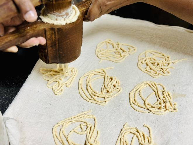 Then comes the crucial component: her almost 40-year-old murukku press made of rosewood. Every time the deep-brown contraption is brought out, she brags about how her mother made an experienced carpenter from Karaikudi customise it when she got married. It continues to be sturdy despite being weathered. Next, she spreads an old white dhoti on the kitchen counter: the canvas on which the murukku will be pressed.