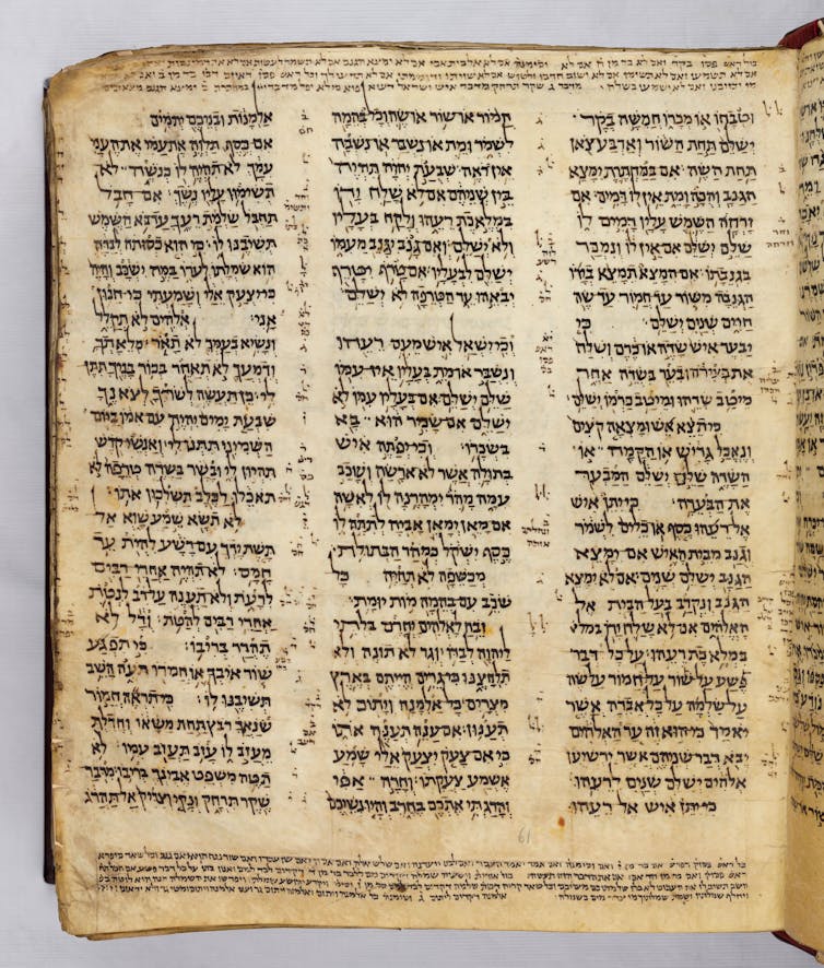 That bible is the Aleppo Codex, dated around AD 930. It is on display at the Israel Museum in Jerusalem. Several pages are missing, but its heir, the St. Petersburg Codex (or Leningrad Codex), copied in AD 1009, is complete. It is this manuscript that serves as the reference for the study of the Hebrew Bible.