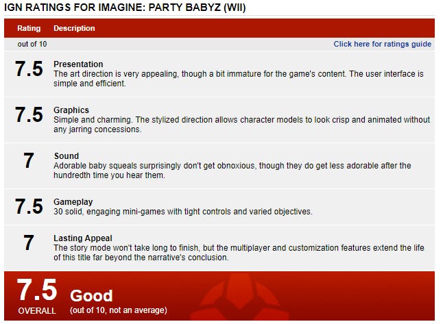 The post in question is a review of Imagine Party Babyz, a Ubisoft-published Nintendo Wii game that’s notable for its bizarre box art featuring real infants in party hats. While it looks like your typical late-2000s shovelware, the review declares “Imagine Party Babyz is one of the finest mini-game compilations to ever grace Nintendo's home console,” to the critic’s own surprise. But it’s the final score that sent gamers into a 13-year tizzy: Imagine Party Babyz receives a 7.5 out of 10.