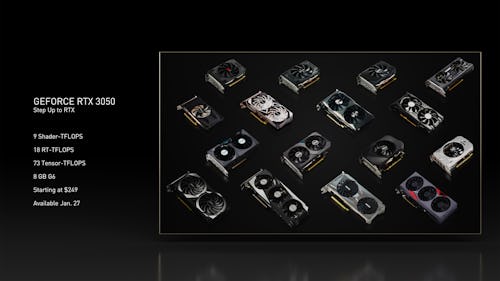 The majesty of RTX gaming simply isn't financially feasible for a large number of PC owners, but the RTX 3050 might help push things in the right direction. Nvidia showed off some numbers that emphasize just how much the RTX 3050 eats the lunch of current budget offerings like the aging GTX 1650. It's unclear how effective this card's ray tracing will be compared to its big brothers, but if you need a new GPU at a pretty competitive price point, the 3050 will serve you well. You might need to do some Discord strategizing to get one, though. It's coming in late January.