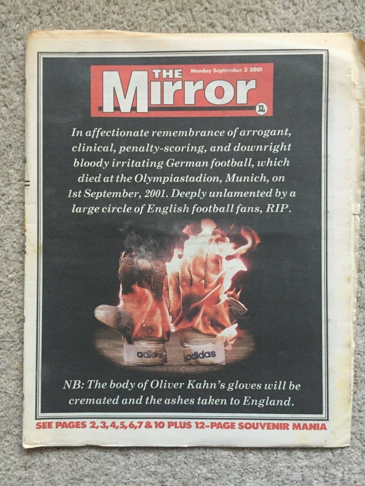 The Mirror hit us with a rather startling image of Oliver Kahn’s gloves on fire which read: “In affectionate remembrance of arrogant, clinical, penalty-scoring, and downright bloody irritating German football, which died at the Olympiastadion, Munich, on 1st September, 2001. Deeply unlamented by a large circle of English football fans, RIP.”