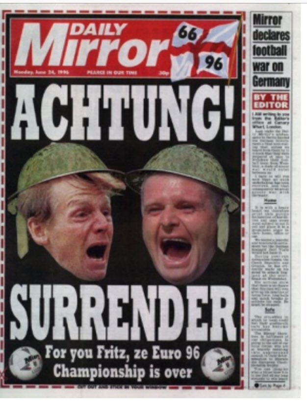 Whisper it quietly, but British today's tabloid coverage of England v Germany today is a far cry from "Let's Blitz Fritz" spirit of 1996. Bawdy, brash and fun, but also respectful. pic.twitter.com/VKd1akdf1i