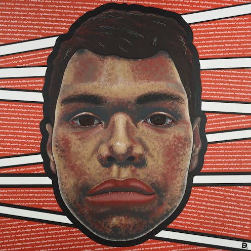 Hoosen’s head fills most of picture, staring out, but his eyes are strangely dead. Blak Douglas has painted them in the tiniest of dotted, concentric circles. The background implies traditional Aboriginal patterning, but on a closer look it contains written text containing Hoosen’s indictment of the white school system and the teaching that eradicates his culture. By any measure this is a major work.