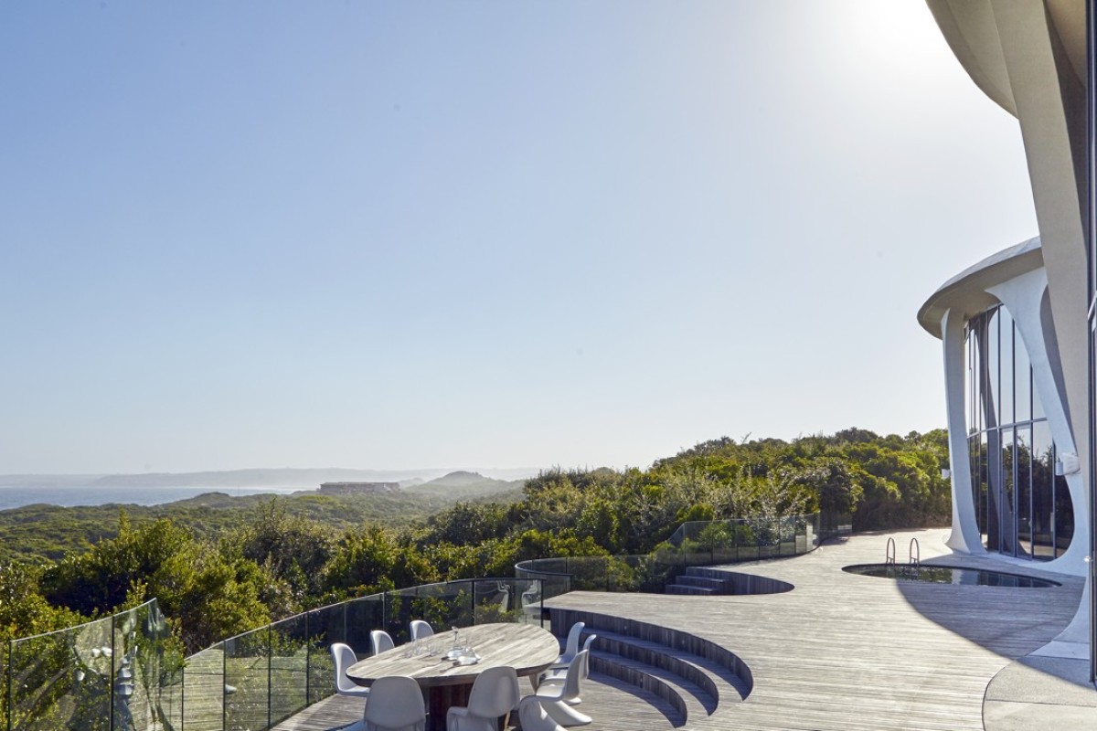 A remarkable sight greets you on the rolling, fynbos-covered sand dunes of Keurboomstrand, north of Plettenberg Bay in South Africa. Some liken the pristine white organically shaped building to a space station, others to a ship. Architect Silvio Rech, who designed the remarkable form with Lesley Carstens and Donald Takura Changwa, who was in charge of the technical drawings, says, “It looks as if it has been eroded like a piece of whalebone on the beach.” He also suggests that from certain angles, you might discern the forms or motion of a pair of swimming whales. “It has the feeling of an organic object or being,” he adds.