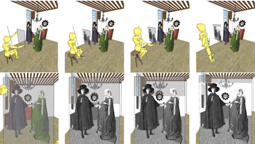 With regard to the Arnolfini Portrait, researchers have underlined the importance of properly representing hands and feet in this era, both in terms of symbolism and aesthetics. Although most of the objects in the painting were drawn only once through the perspective of the eyepiece placed farthest forward, our models suggest the male figure’s feet and raised hand were drawn using other eyepieces.