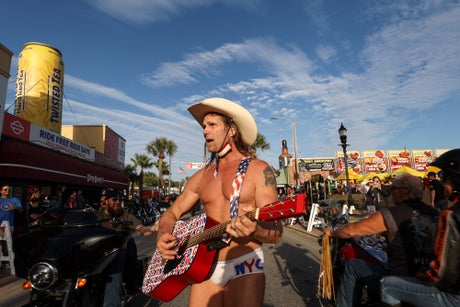 Court records show Robert Burck, 51, who is widely known for wearing only white briefs, boots and a cowboy hat while playing a brightly colored guitar, was arrested Saturday while performing at the annual event on Florida's Atlantic coast. Burck is a regular at Bike Week.