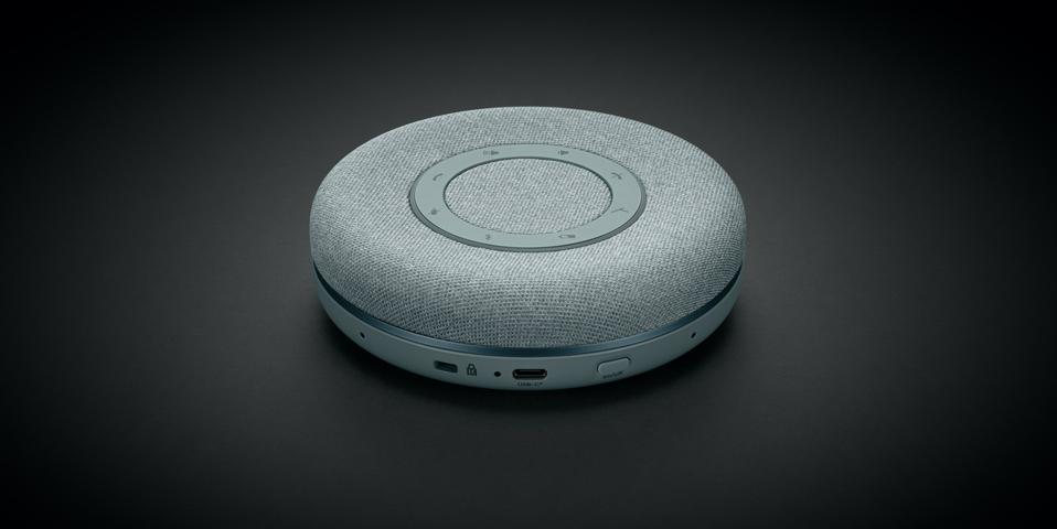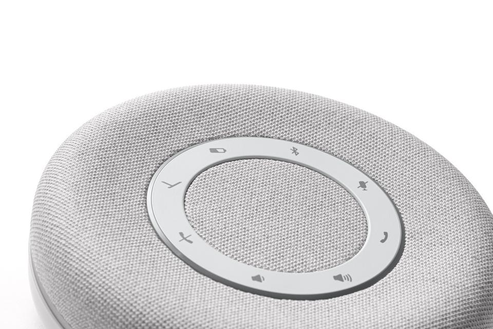 The SPACE is a stylish-looking speakerphone available in three colors – Nordic Grey, Charcoal and Aquamarine – and is covered in a hard-wearing material that looks incredibly stylish. The top of the speaker features a ring LED that changes color to reflect a range of functions including volume level and battery charge. Inside the ring is a circle of touch buttons that are used to do all the important stuff like turning up the volume, ending calls, Bluetooth pairing, etc.