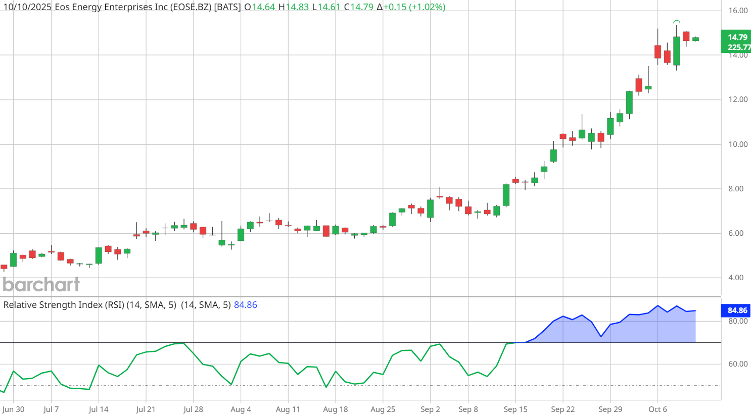 Right now, John notes that EOSE continues to show extremely overbought conditions at both the daily and weekly levels. However, he says that a weekly close above $14.20 would put the psychologically significant $20 level into play.