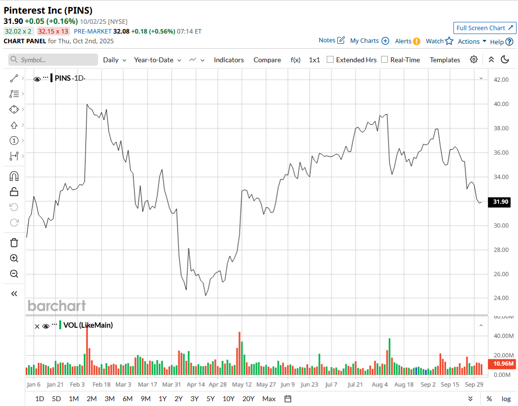 Pinterest trades at a forward price-earnings ratio of 44.53x, well above that of both Meta Platforms (META) at 25.3x and Alphabet (GOOGL) at 24.7x. However, it is undervalued when considering the price-sales ratio, where it stands at 5.85x compared to META’s 10.89x and GOOGL’s 8.49x.