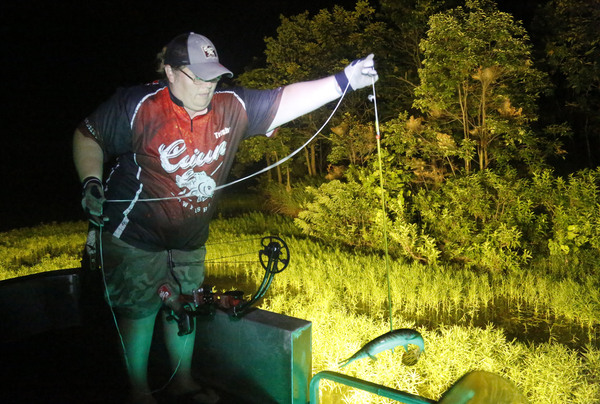 For five hours, they stood in a high platform on their 21-foot boat, staring at where 20 LED lights cast a soft glow into the lake. The Whiteheads talked often, but at times the only sounds were the singing of frogs, buzzing of insects, once the yodel-like calls of coyotes and the hum of a gas-powered generator.