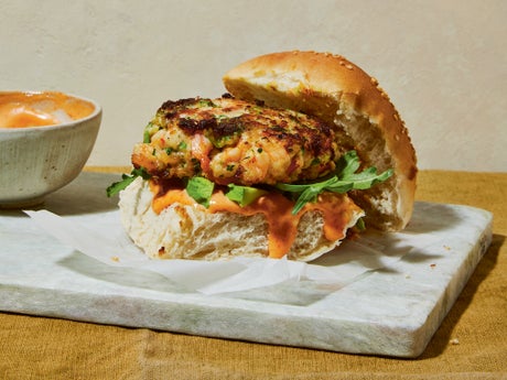 Shrimp burger with sriracha mayo from ‘The Shortcut Cook’ by Rosie Reynolds