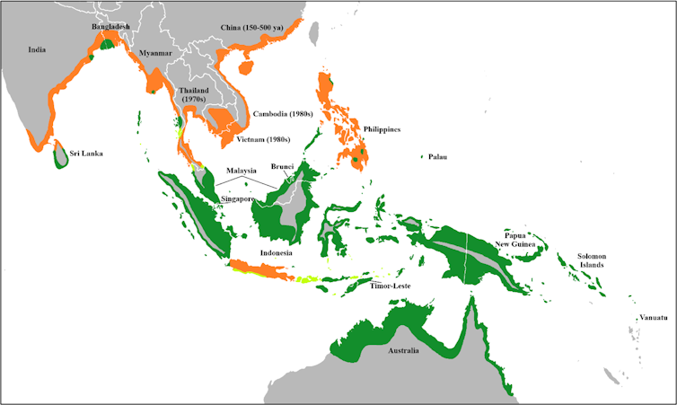 The saltwater crocodile was once found widely across the Indo-Pacific region. Now, there are no saltwater crocodiles in several countries including Cambodia, China, Seychelles, Thailand and Vietnam.