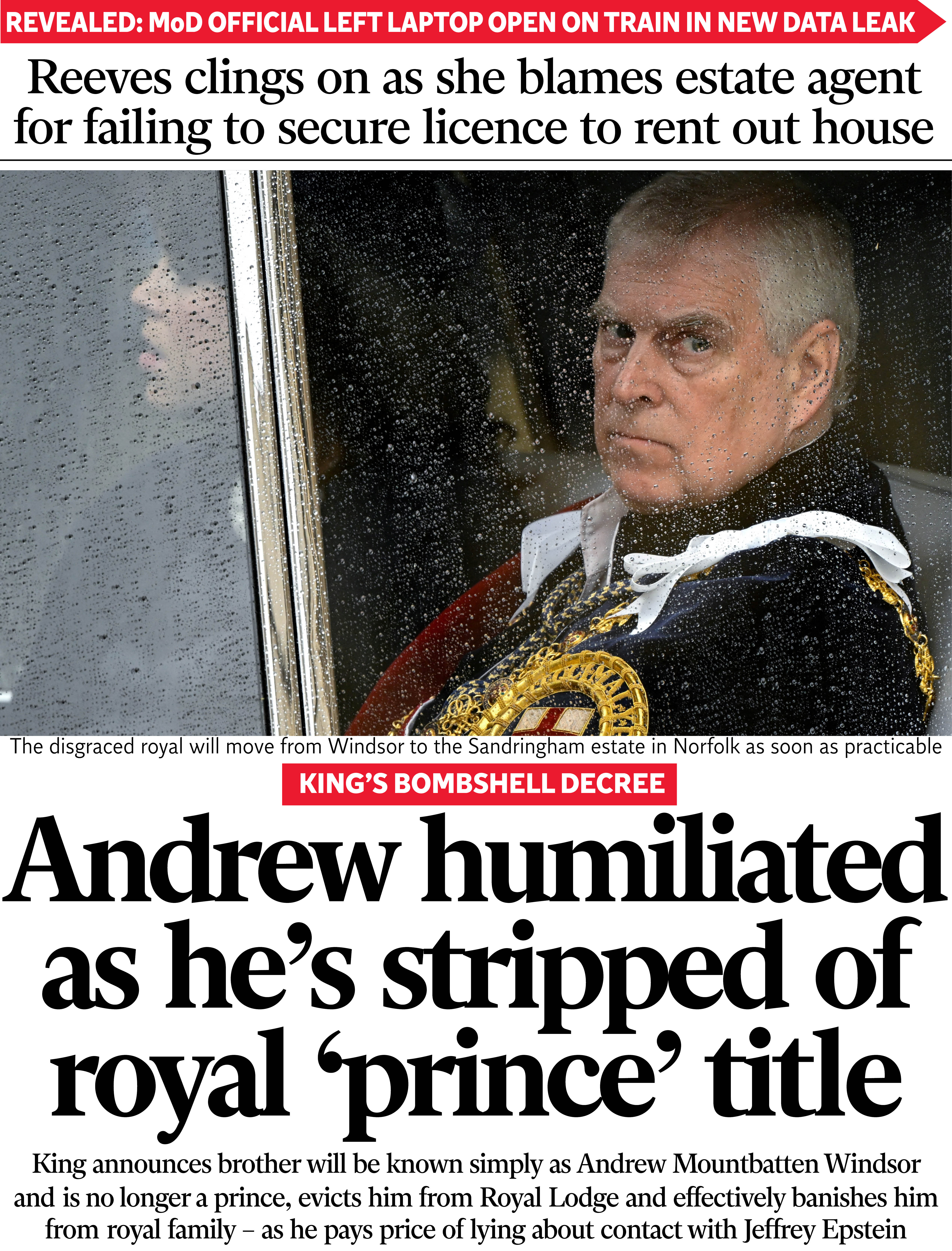 The Independent presented the story on the front cover of Friday’s edition, referencing the King’s “bombshell decree” and writing that Andrew had “paid the price” for his contact with Epstein.