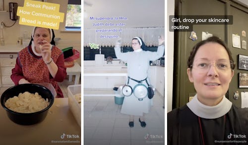 Much digital ink has already been spilled about NunTok, and with good reason. TikTok is likely the best social media platform for people who aren't online all day. The algorithm picks things up, making viralty easier than other platforms that would require more finesse. TikTok memes are an easy access point to align the format with your circumstance. Popular genres of NunTok videos include convent pranks, memes like this viral "This or That challenge," little jokes, and whatever this and this is, snippets of their lives and everyday nun stuff or day-in-the-life vlogs, and answers to questions, especially about how they entered the faith. Like most Catholicism, a lot of the content is somewhat obsessed with death. Sometimes they just pray, do some Catholicism, or dance. Sometimes they peel carrots or make communion wafers. Sometimes they leave the convent.