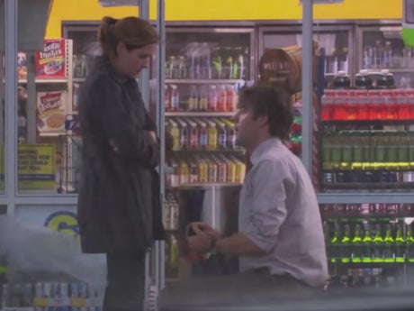 Jim proposes to Pam in the season five premiere, “Weight Loss”. The unexpected moment comes as the pair meet at a gas station between New York City, where Pam is completing a graphic design class, and Scranton, where Jim still works at Dunder Mifflin.