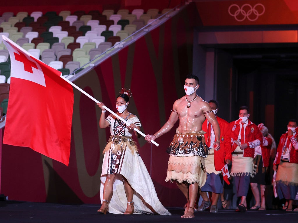 The 37-year-old athlete walked out during the parade of athletes in Tokyo on Friday wearing traditional clothing from the Pacific Island, a hid ta’ovala wrapped around his waist.