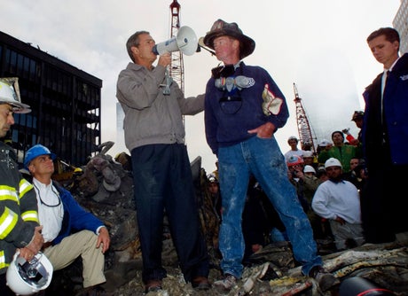 Using a bullhorn, Bush responded: “I can hear you! I can hear you! The rest of the world hears you. And the people who knocked these buildings down will hear all of us soon.”