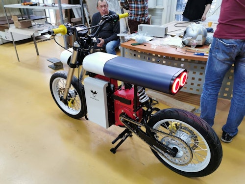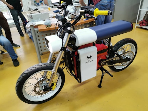The motor powering the bike, which was apparently custom-designed, has 20 kW of power in "overboost mode" and 15kW nominally, which translates to a top speed of about 83 mph. According to the company's Facebook page, the bike comes with two removable 2.5 kWh batteries that will take you 68 miles (or 110 km) or according to Electrek, and that does actually seem plausible. But, in the video posted on Punch Motorcycle's Facebook page (below), the rider picks up the battery a little too easily for me to believe that the ones we're seeing are actually 2.5 kWh, as they would be quite heavy.