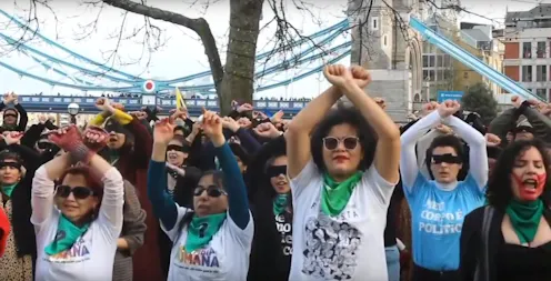 Responding to a social media call by Latin American women living in the city, hundreds of feminist activists gathered on the south side of Tower Bridge on December 7. Wearing colourful clothes, black blindfolds and pañuelos – green scarves symbolising the campaign for legal abortion – they sang and performed a choreography rich in political symbolism.
