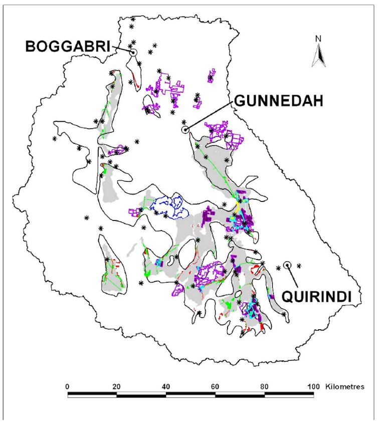 The extent of the potential damage is detailed in the map and caption below. The green line running southeast from Gunnedah is the narrow strip of native grassland along the Pullaming stock route.
