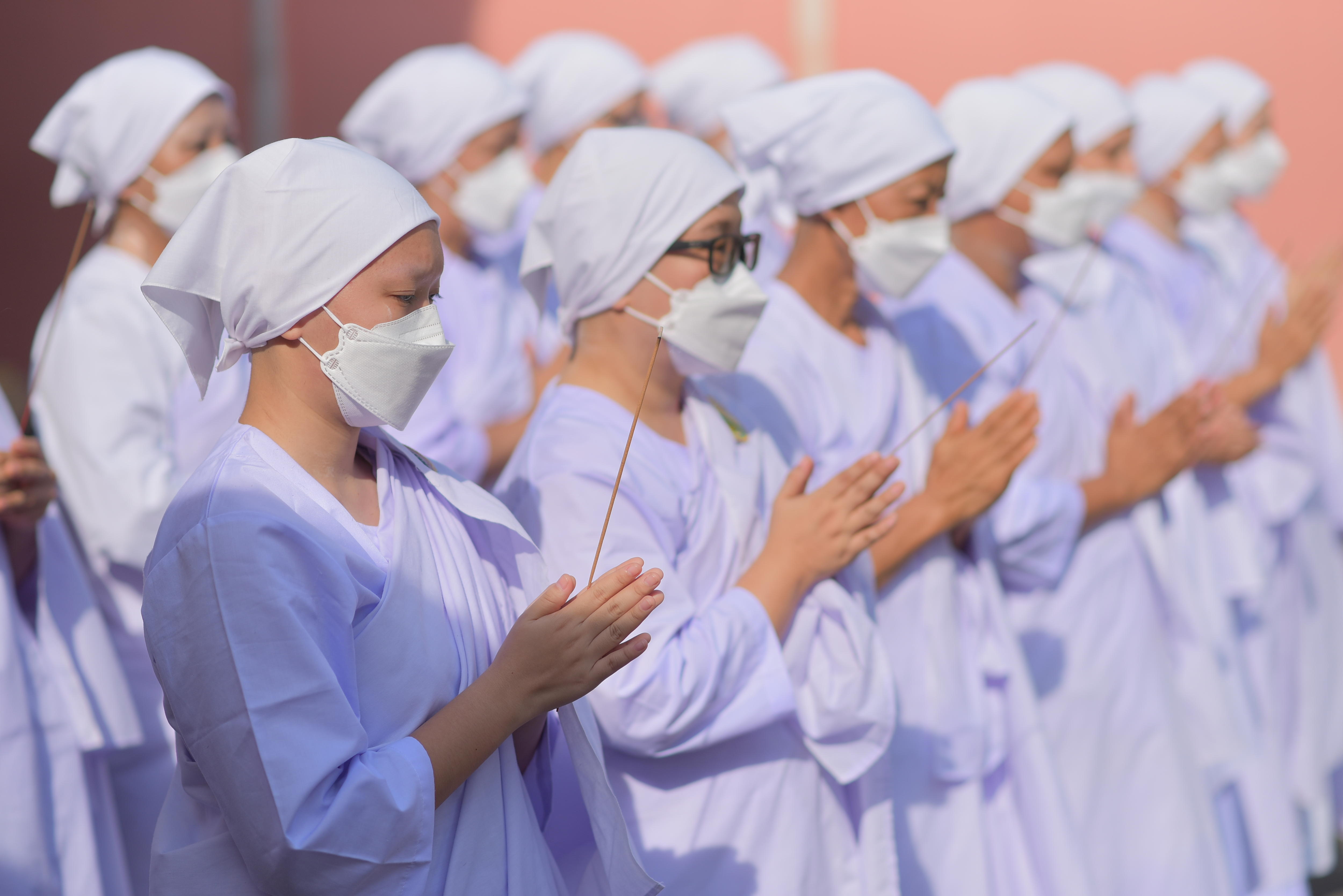 The ceremony lasts for several hours, with the women committing to uphold the teachings of the Buddha and changing into saffron robes.