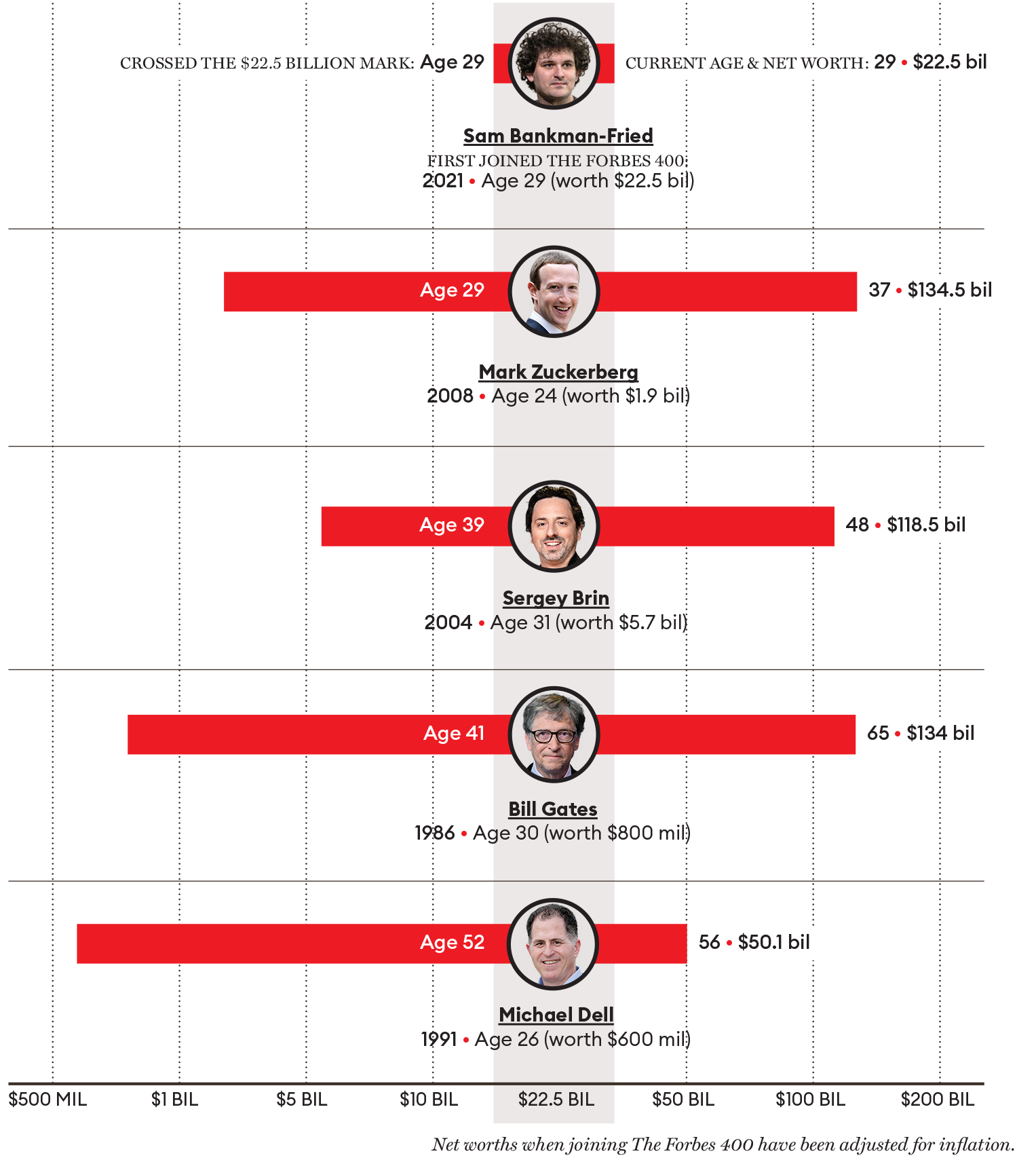 Worth $22.5 billion, Sam Bankman-Fried is the richest self-made newcomer in Forbes 400 history. And at 29, he’s one of the youngest. Here’s how he stacks up against the competition.