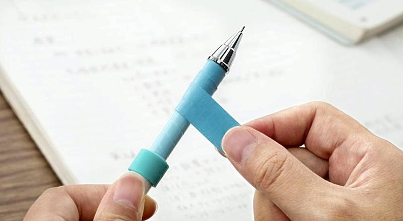 This mechanical pencil comes with a way to personalize it for a more comfortable grip. Users can loop the tape-shaped grid bands as they like to fine-tune the overall shape. There are two kinds of tape bands. One is a dry type that easily absorbs sweat and the other is a wet type for a softer touch.