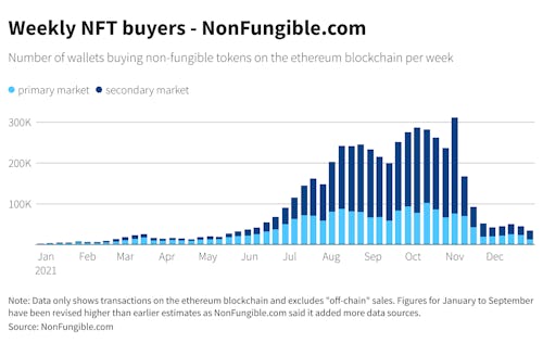 Somewhat, but it's not really clear. The Wall Street Journal ran a story last week that claimed that the NFT market was "collapsing," which led to a firestorm of discourse on social media. This piece was based on data from the tracker site NonFungible that showed that the sale of NFTs recently fell to a daily average of 19,000, which was a 92 percent decline from its September peak of 225,000. The number of active wallets also fell 88 percent, and some notable NFTs that were recently listed for sale failed to attract competitive bids.
