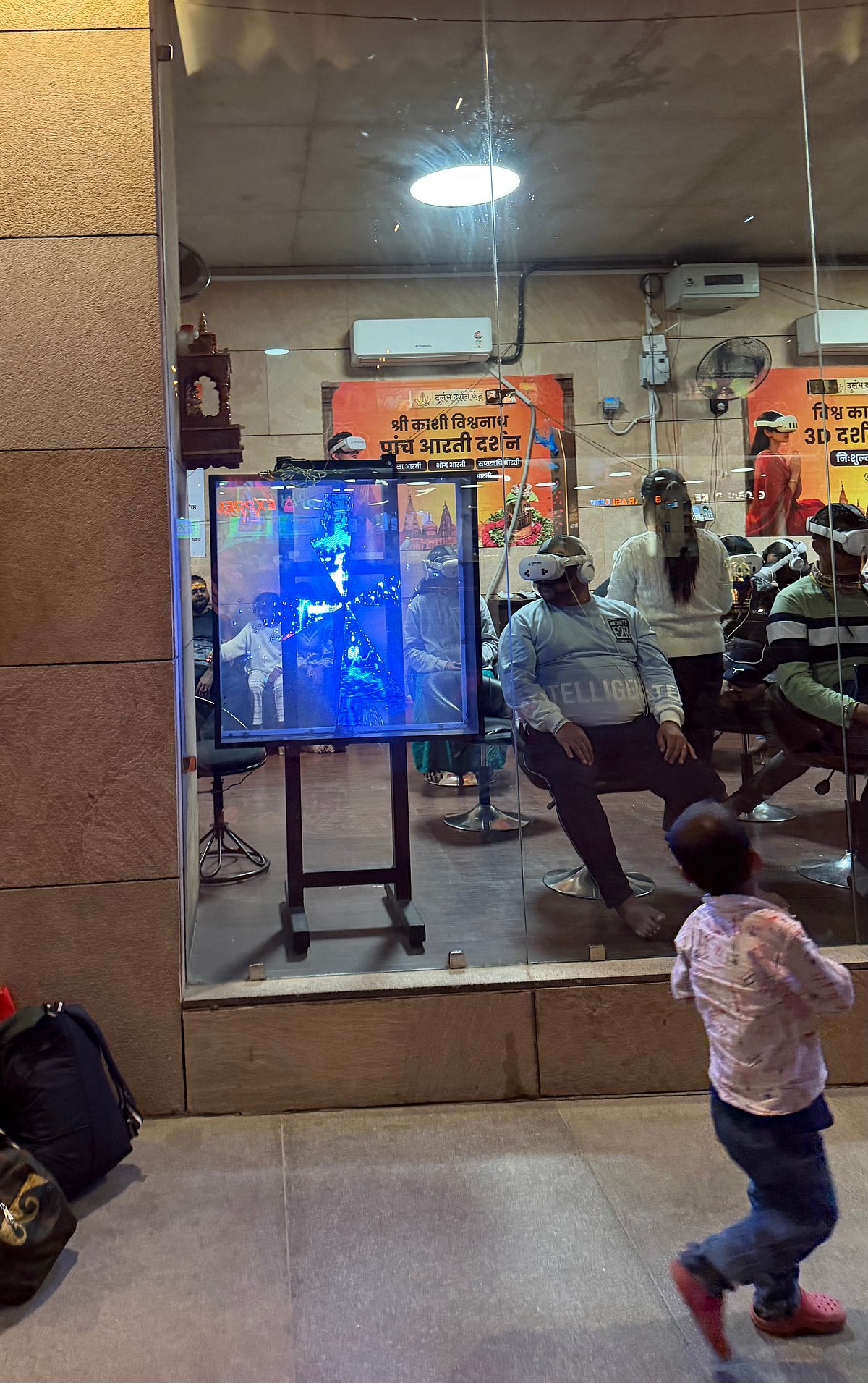 Visitors line up for a chance to whizz. The ticket counter is open. Men sit around with 3D visors rapt in simulated Kailash Parbats and Shiva verses as hi-vis devices download quick anime mythology lessons.