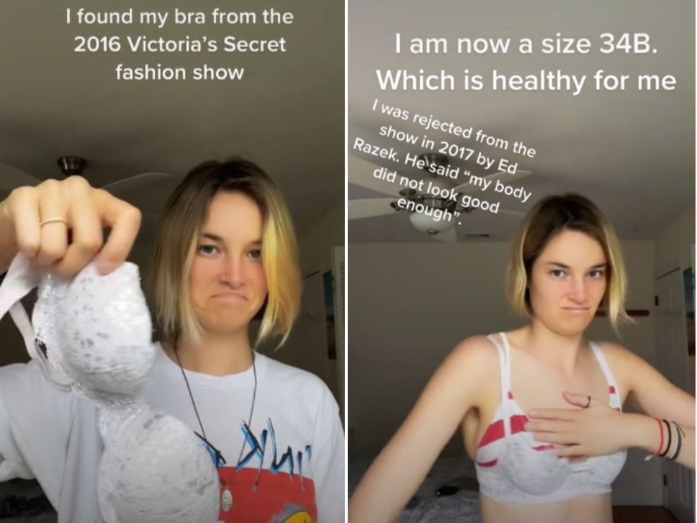 Former Victoria Secret model Bridget Malcolm shares the bra she wore in the fashion show to highlight the harmful beauty standards the company endorsed