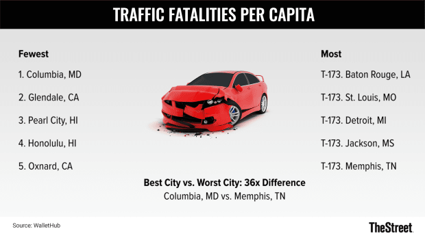 When looked at per capita, traffic accidents were the most frequent in Baton Rouge and St. Louis and least likely to occur in Maryland's Columbia and California's Glendale.