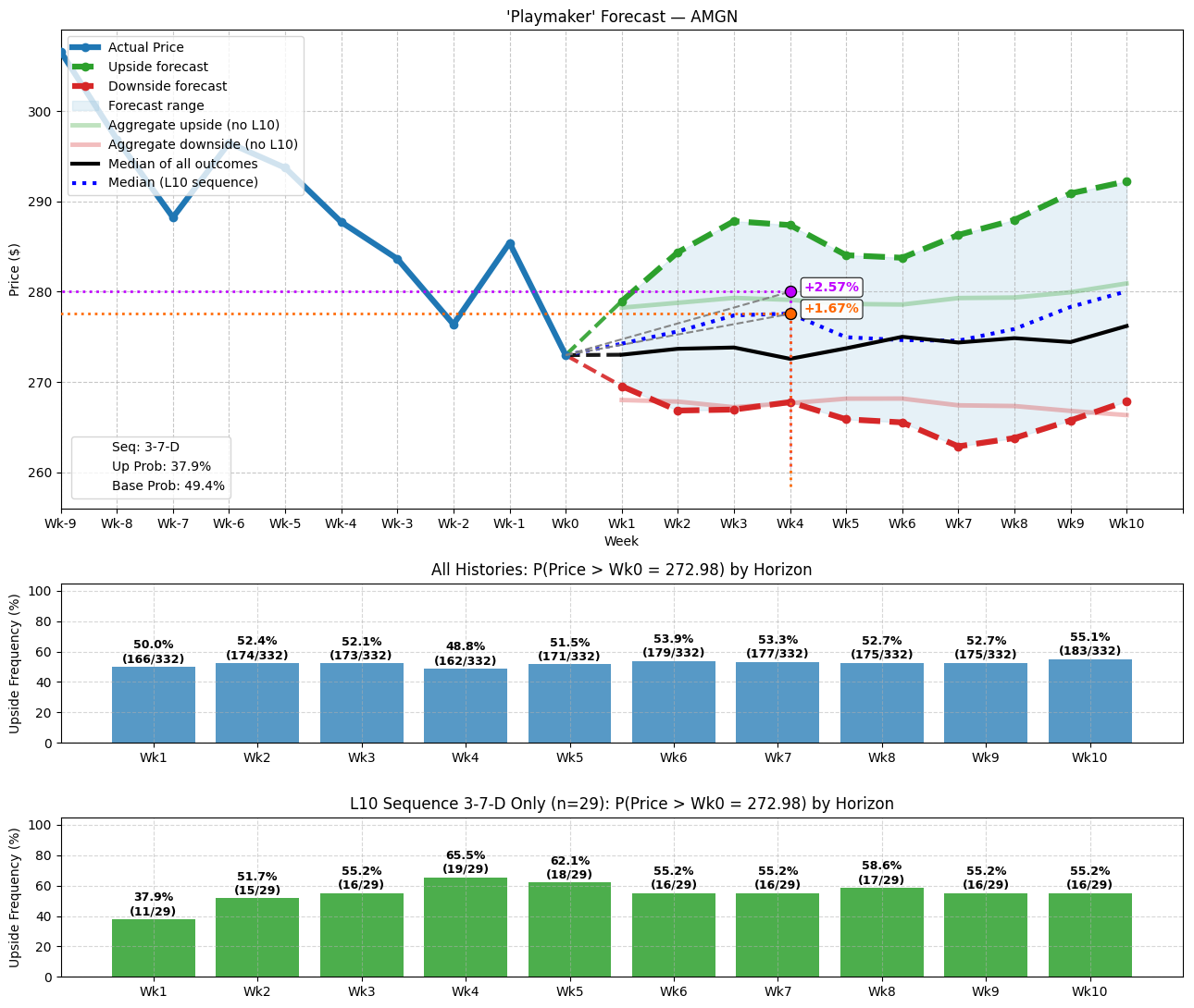 In the past 10 weeks, AMGN stock has printed a 3-7-D sequence: three up weeks, seven down weeks, with an overall downward trajectory across the period. This quantitative signal is rare, having only materialized 29 times on a rolling basis since January 2019. In the early weeks following the flashing of the signal, the probability of upside isn’t all that much greater than the baseline probability.