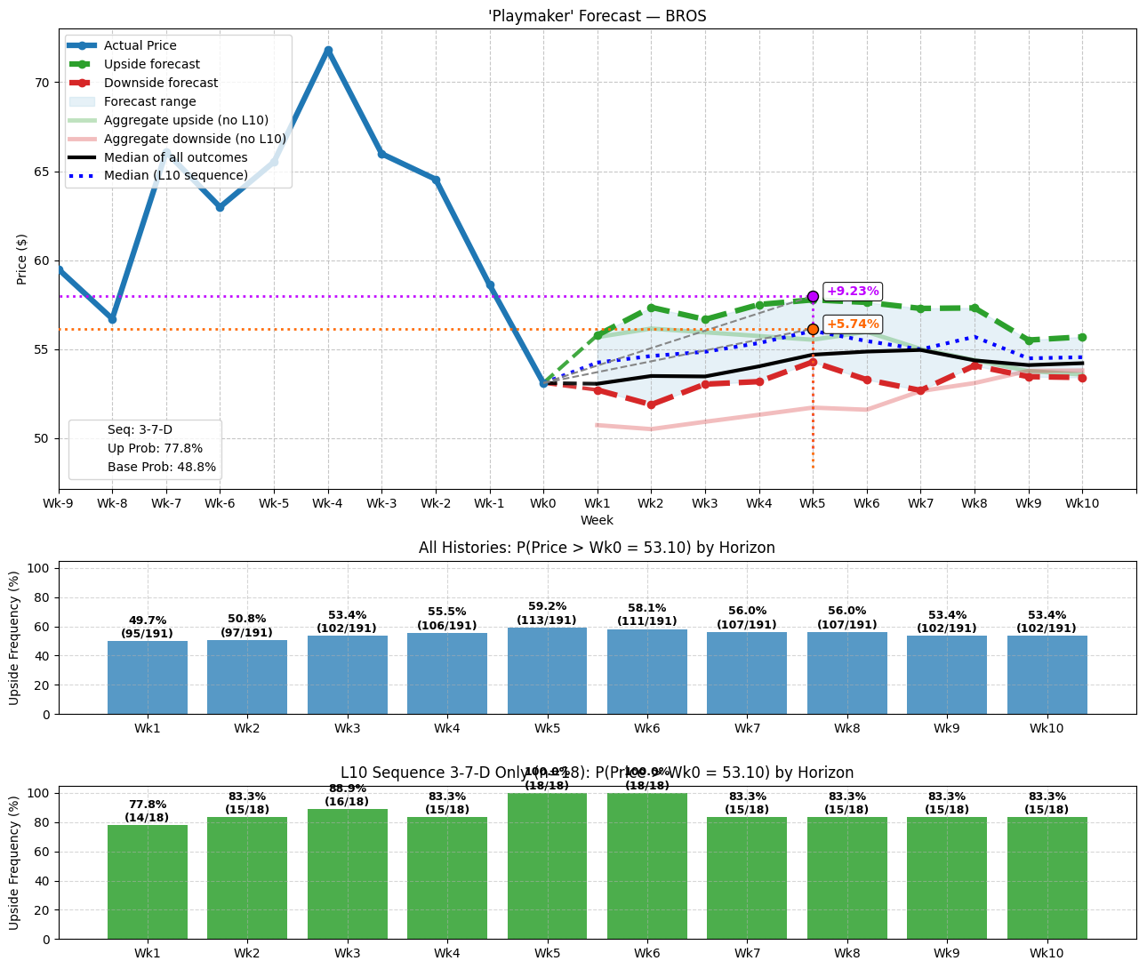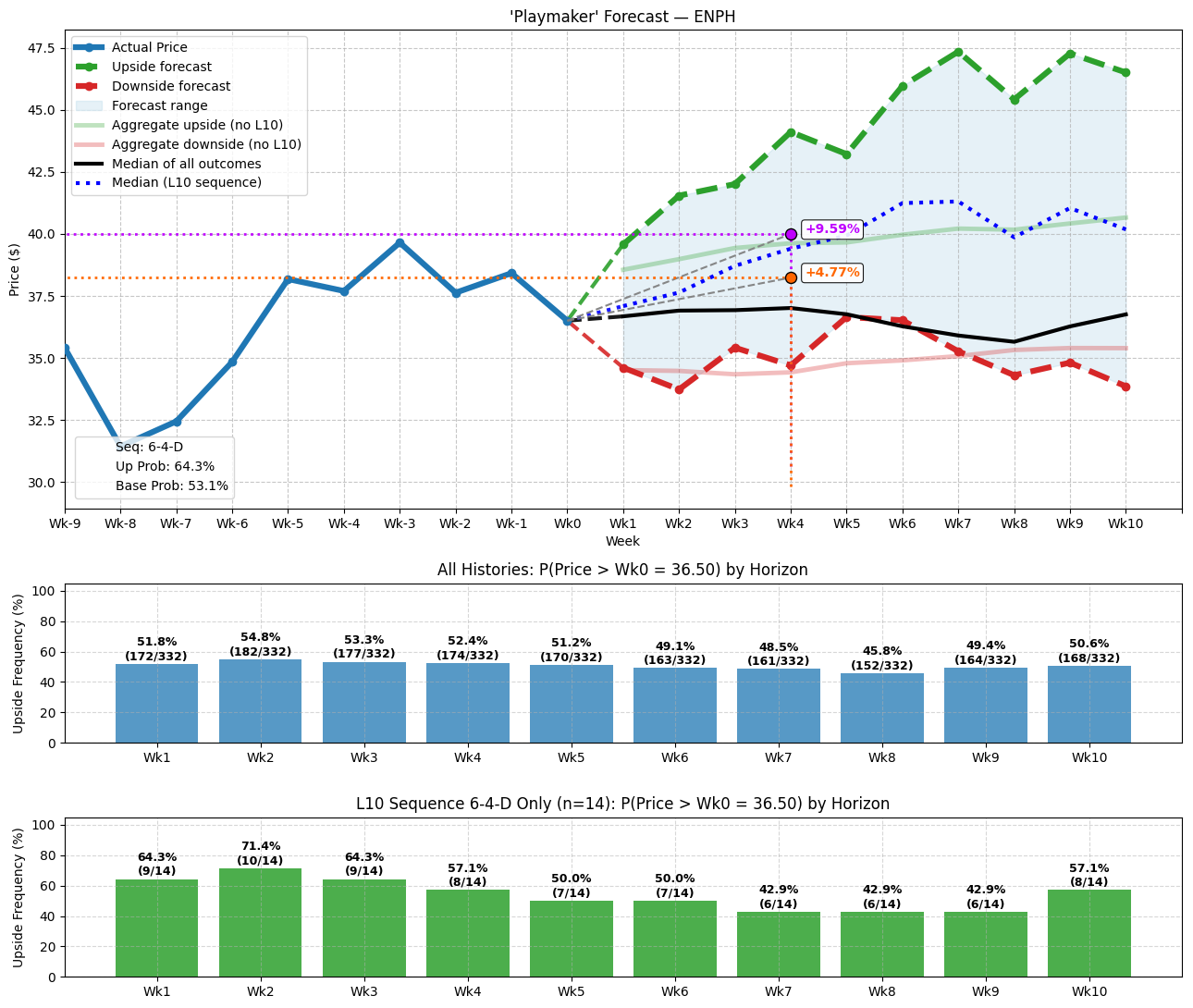 - Markovian distribution: Each week features a conditional probability of upside success based on how the sequence of the last 10 weeks impacts the forward 10 weeks.