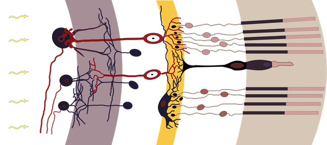 In this cross-sectional view of the retina, name the cells at the extreme right. They enable vision when it is dark but can’t sense colours. RAMON Y CAJAL (CC BY-SA 3.0)