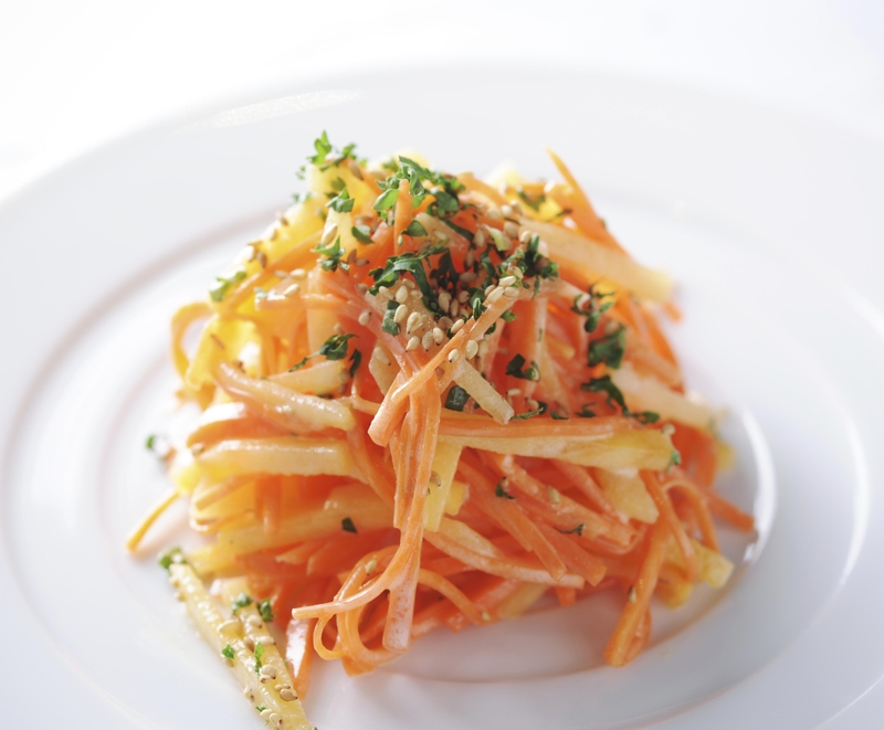 Julienne one-third of a carrot and mix with a pinch of salt. Next, julienne half a persimmon. Mix 2 tablespoons of yogurt, 1/2 teaspoon of honey, 1 teaspoon of lemon juice, 10 milliliters of olive oil and a pinch of salt in a bowl and toss with the carrot and persimmon. Sprinkle with chopped parsley and a pinch of roasted white sesame seeds.