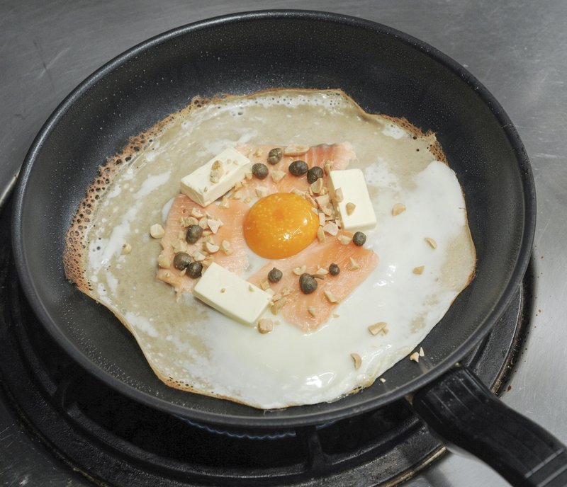 French cuisine chef Yasuyuki Takara shared his recipe for salmon and cream cheese galettes, or crepes made from buckwheat flour. Buckwheat flour galettes are a specialty of Brittany in western France.