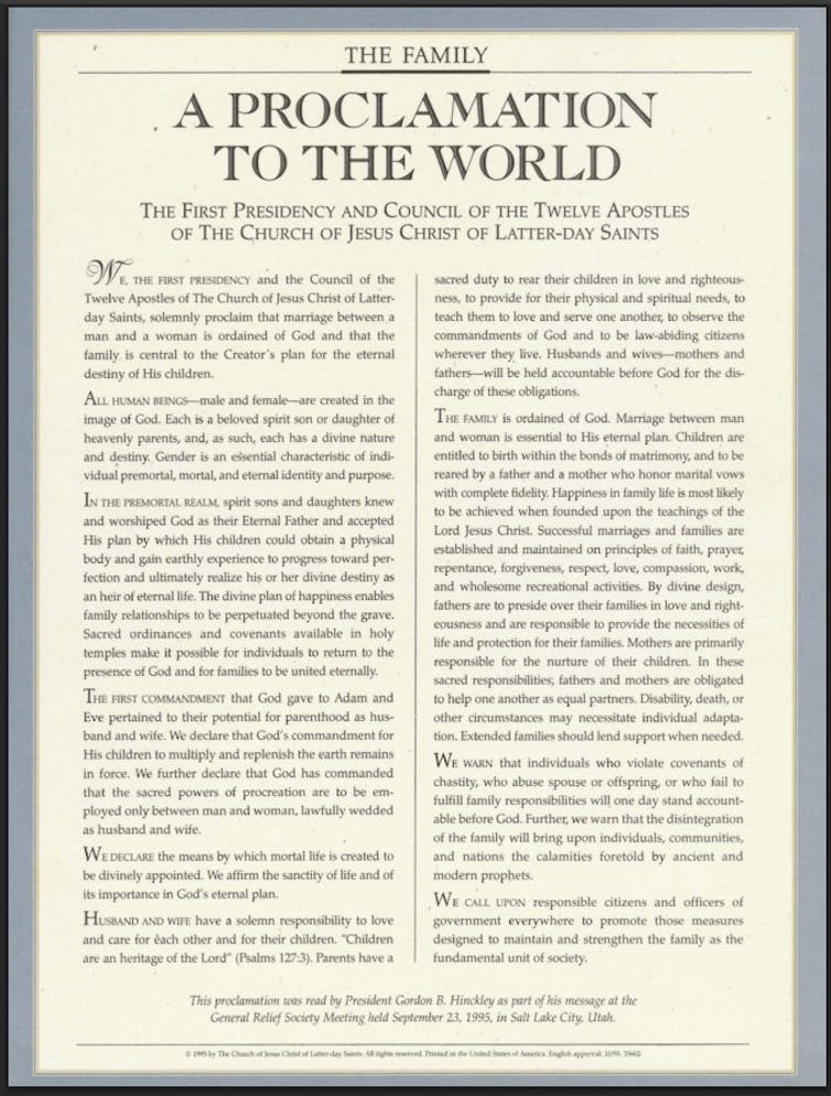 Since the ending of polygamy, the church has sought to establish itself as a moral equal to mainstream Christian norms, especially sexual norms. In 1995, it released a document titled Family: A Proclamation to the World which emphasised the view that heterosexual marriage and strict gender roles are divinely ordained.