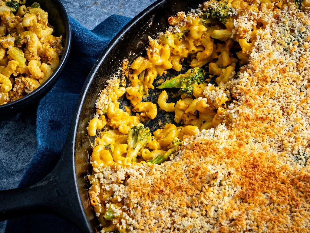 Drain the pasta and broccoli and return to the pot. Pour in the sauce and stir to fully coat. Return the mixture to the cast-iron skillet and smooth into an even layer.