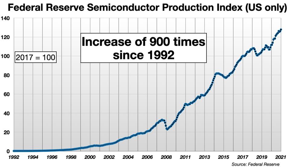 - According to the Federal Reserve, the index of semiconductor production sales volume has increased by a factor of about 33 times since the year 2000 — and 900 times since 1992
