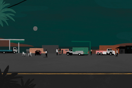 Stalls sell crackling chicken feet and sizzling plantain. Scores of men and women are gathered by a makeshift bar topped with corrugated steel. Spirits are high. The sound of laughter rises above the rumble of trucks trundling by.