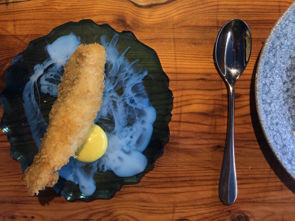 The decor is muted, to say the least. There’s a faint nautical-cum-beach feeling from the dark blue, grey and white tones to the minimal art on the wall: a painting of an octopus and a sculpture of a school of fish. But we’re not here for the interiors. We’re here for the food, which sings.