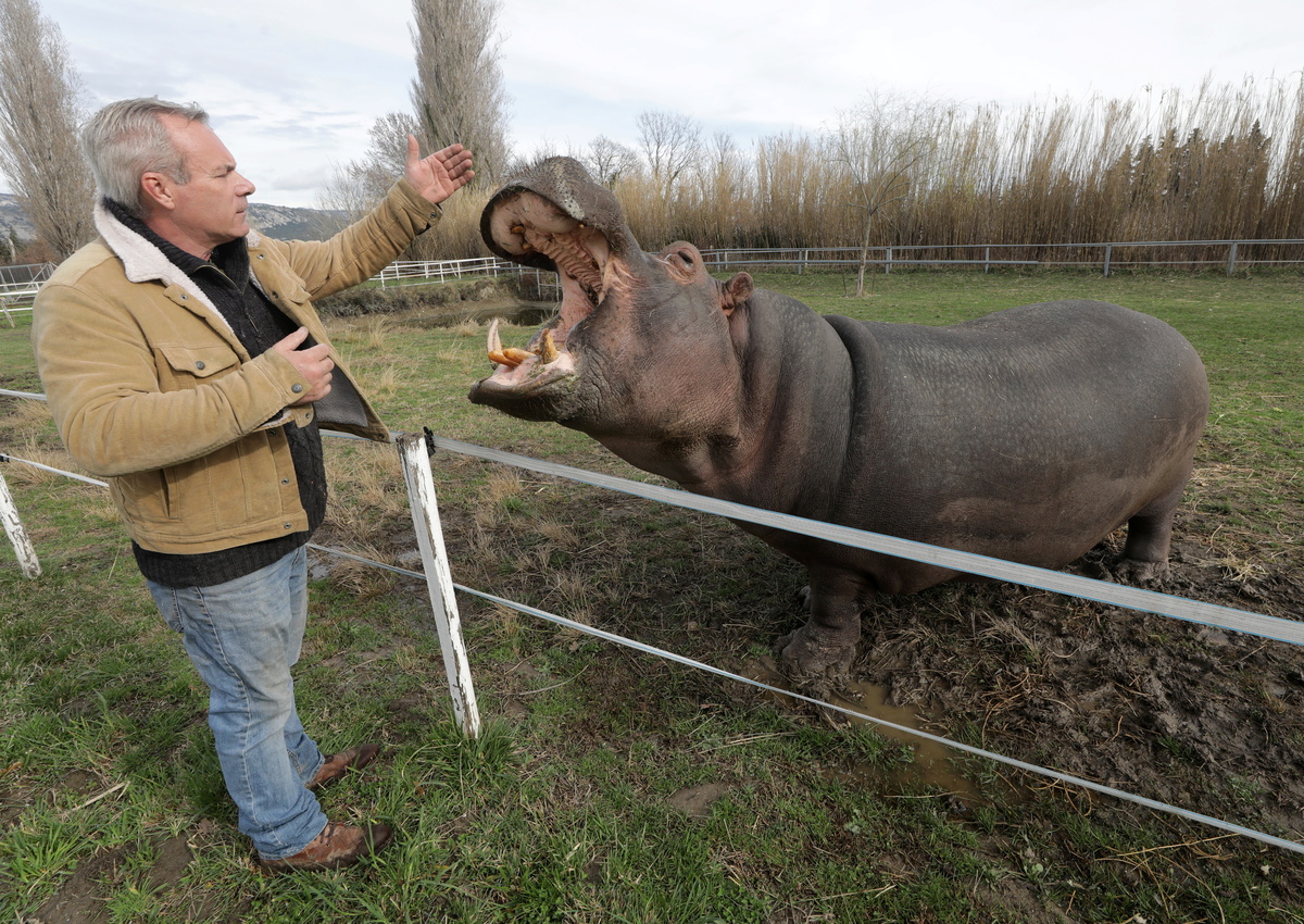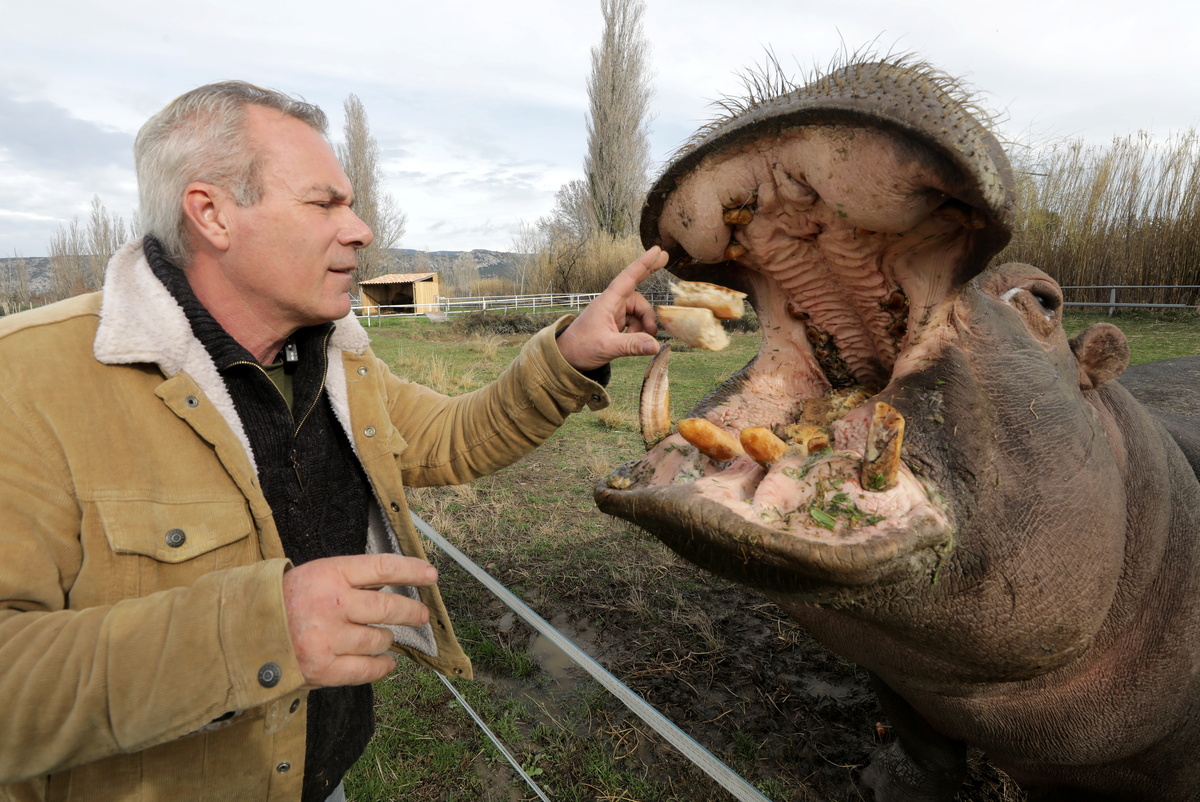 William Kerwich, owner of the Royal Circus and President of the Circus and Shows Animals Union, feeds Molly the hippopotamus at the circus home base in Senas as circus shows remained shut as part of COVID-19 restrictions measures to fight the coronavirus disease outbreak in France, February 9, 2021. REUTERS/Eric Gaillard